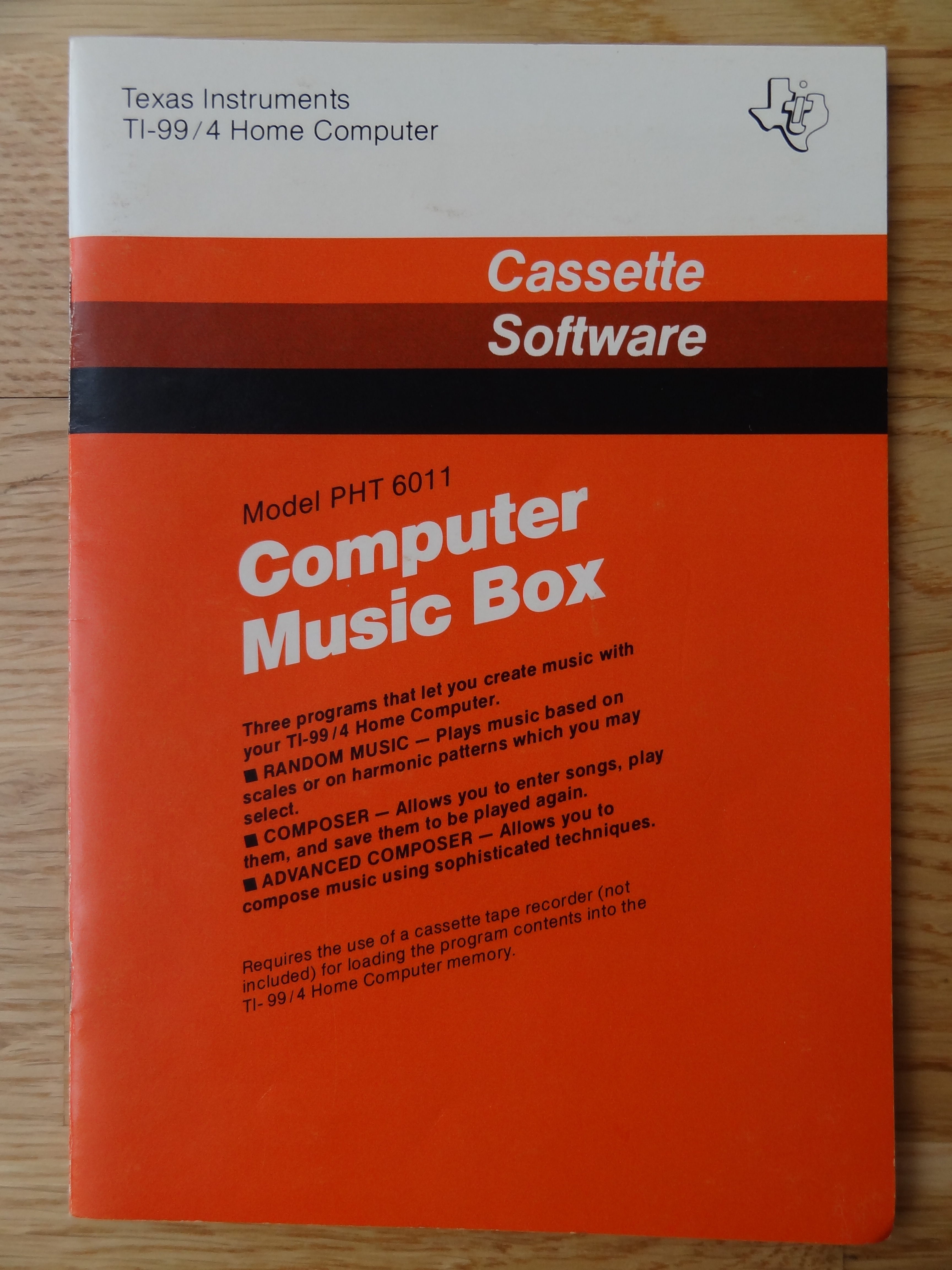 Computer Music Box Manual Cover ← Previous Next → Computer Music Box PHT 6011, 1041557-511 © 1980 Texas Instruments Texas Instruments Home Computer Cassette Software