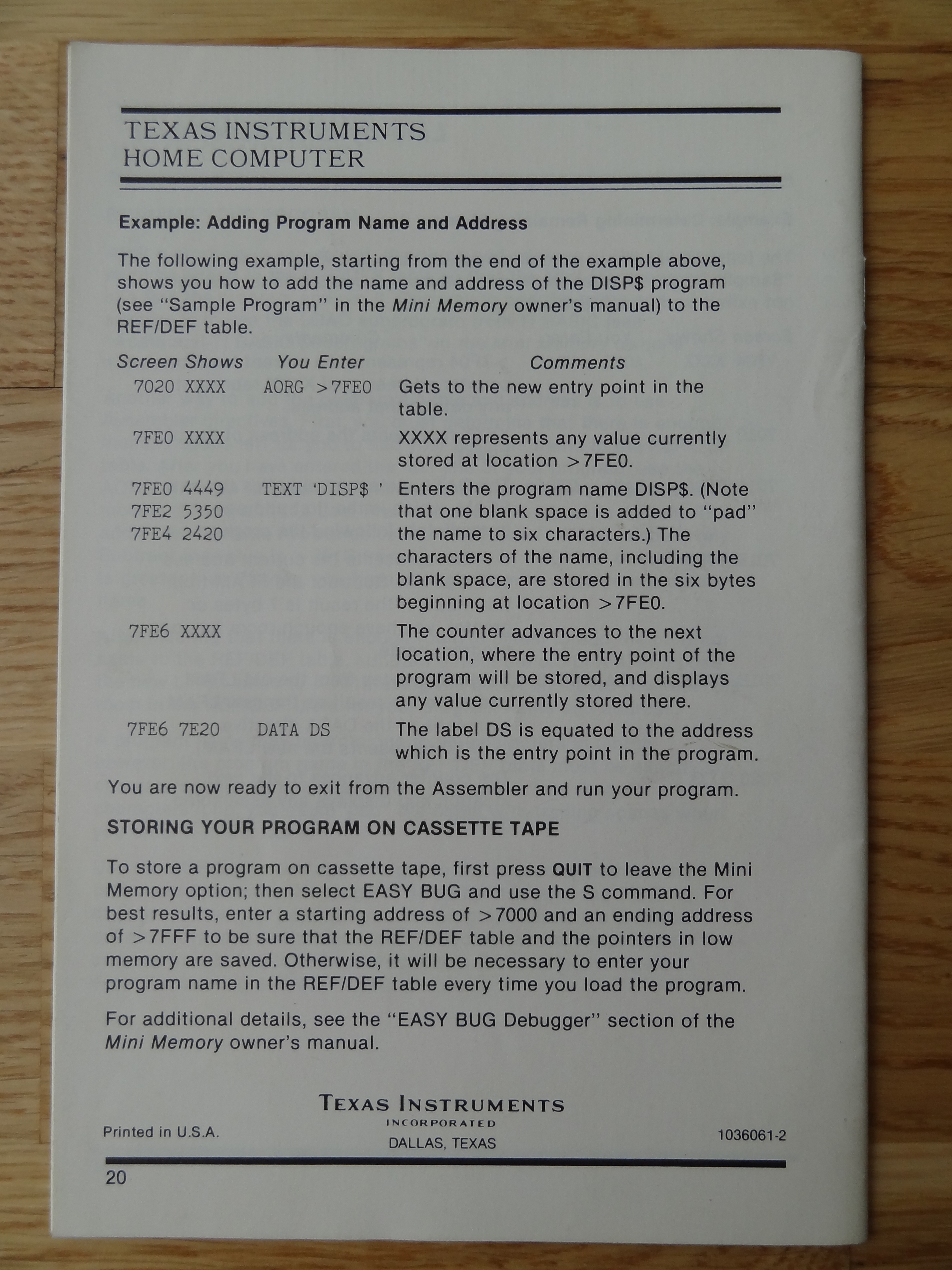 Line-by-Line Assembler Manual Backcover ← Previous Next → Line-by-Line Assembler PHT 6071, 1036061-2 © 1982 Texas Instruments Texas Instruments Home Computer Cassette Software