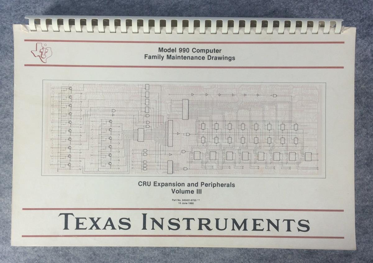 Model 990 Computer Family Maintenance Drawings CRU Expansion and Peripherals Volume III (945421-9703) (1980) by Texas Instruments for TI990_1 ← Previous Next → CRU Expansion and Peripherals Volume III 945421-9703 with permission from http://www.ebay.com/usr/longtermgaming