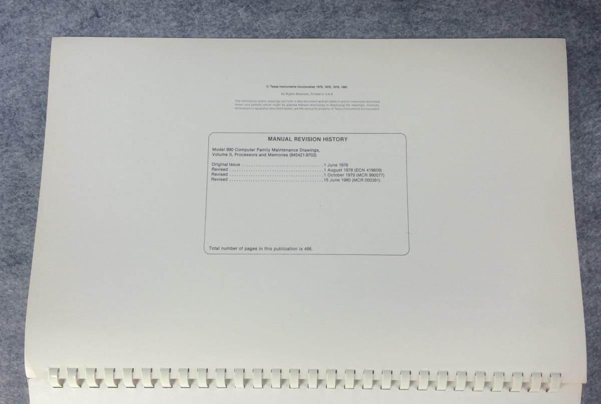 Model 990 Computer Family Maintenance Drawings Processors and Memories Volume II (945421-9702 B) (1980) by Texas Instruments for TI990_3 ← Previous Next → Processors and Memories Volume II 945421-9702 B with permission from http://www.ebay.com/usr/longtermgaming